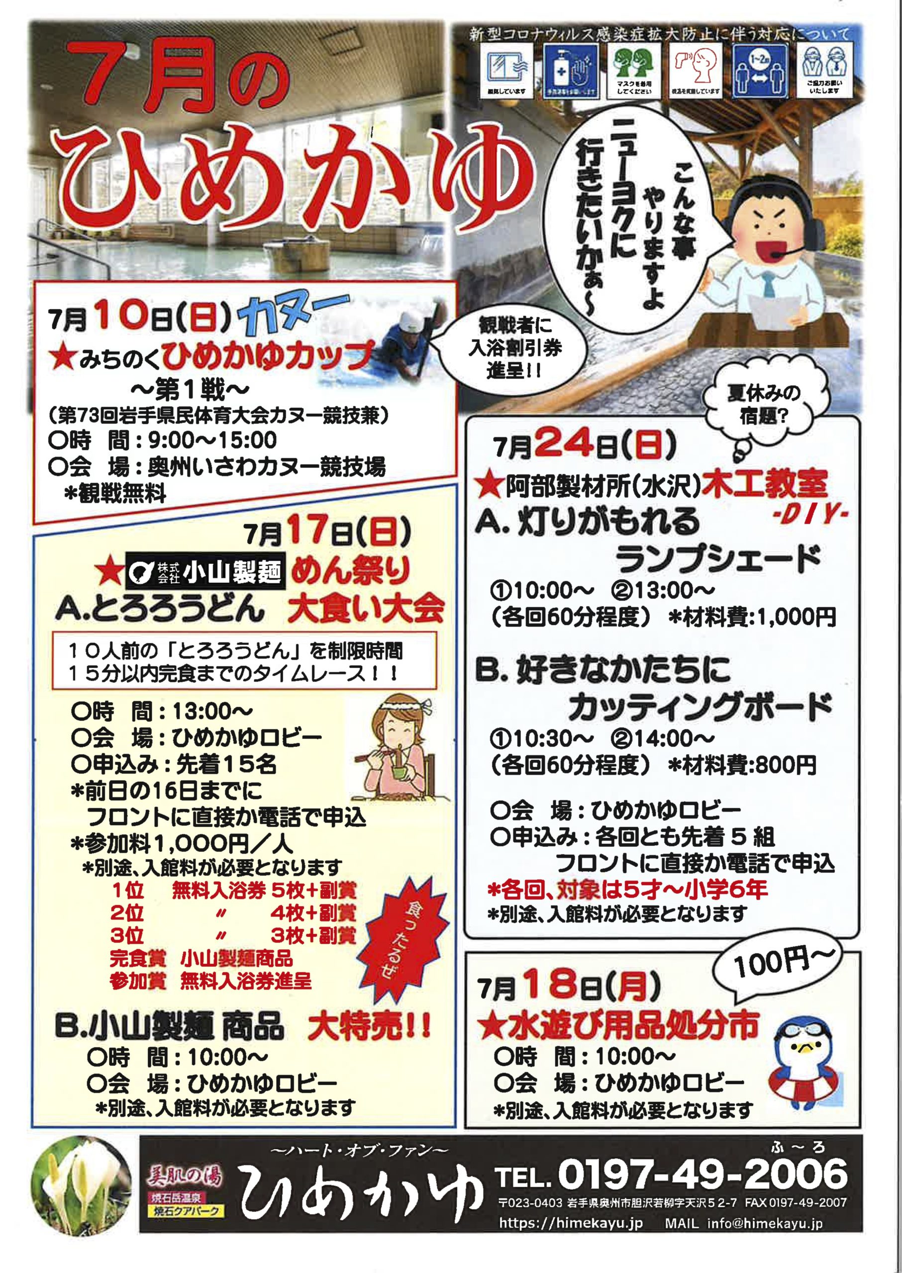 10日はカヌーひめかゆカップが奥州いさわカヌー場にて開催されます。観戦された方にはひめかゆの入浴割引券をもれなくプレゼントいたします。17日は小山製麺様のめん祭り。人気商品大特売と大食い大会を開催予定です。24日は阿部製材所様の木工教室。対象は5歳から小学6年生まで。夏休みの思い出作りにぜひ、ひめかゆまでお越しくださいませ。