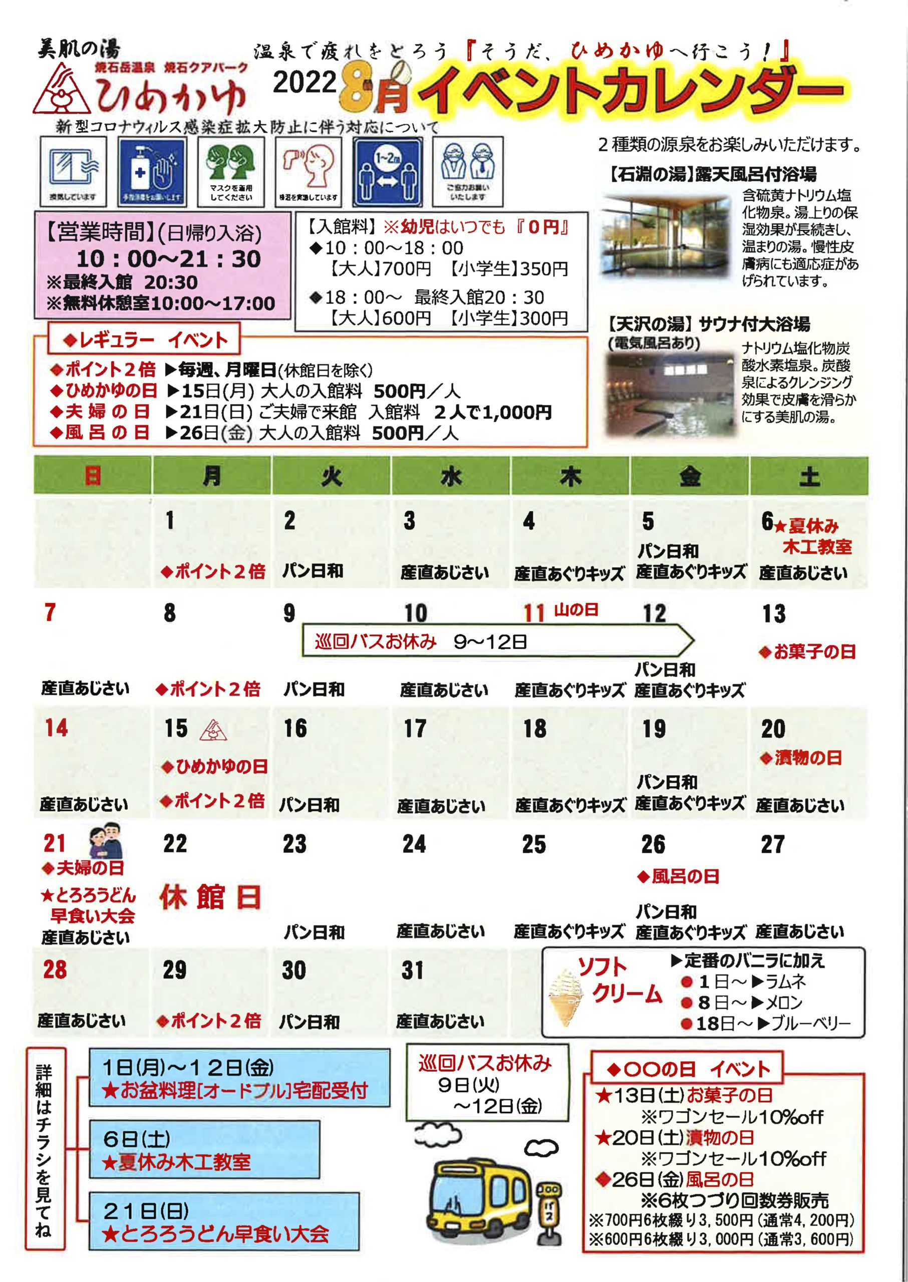 月のイベントカレンダー出来上がりました。9日~12日は巡回バスをお休みさせていただきます。