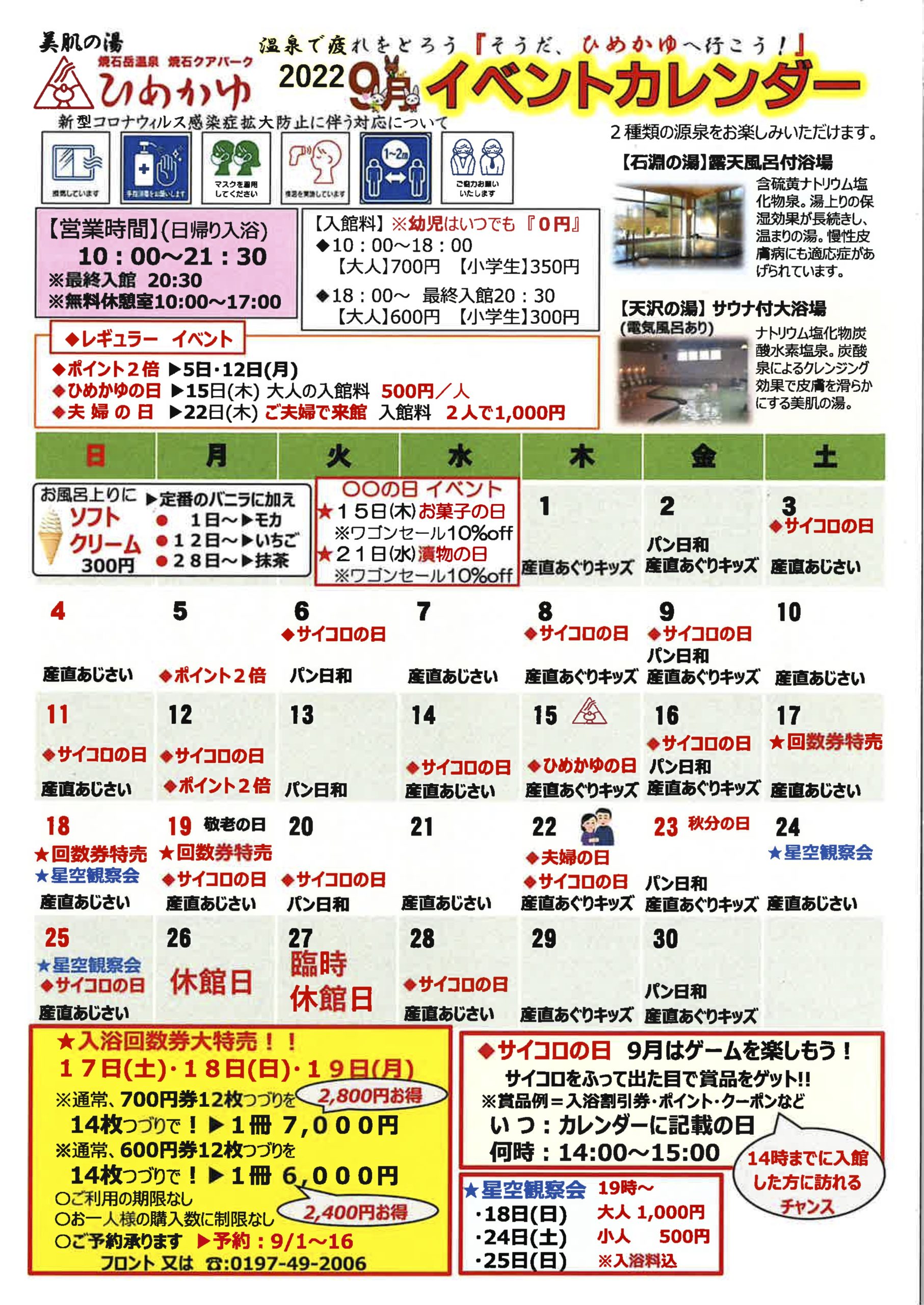 9月のイベントカレンダーのご紹介です。入浴回数券大特売を17~19日の三日間開催いたします。通常12枚つづり7,000円を14枚つづり7,000円に増量しての販売となります。今回は利用期限も購入数制限も一切なし。この機会に是非お買い求めくださいませ。 9月は休館日26日(月)の翌日27日(火)も温泉設備メンテナンスの為休館とさせていただきます。ご不便をおかけしますが、ご理解の程お願い申し上げます。