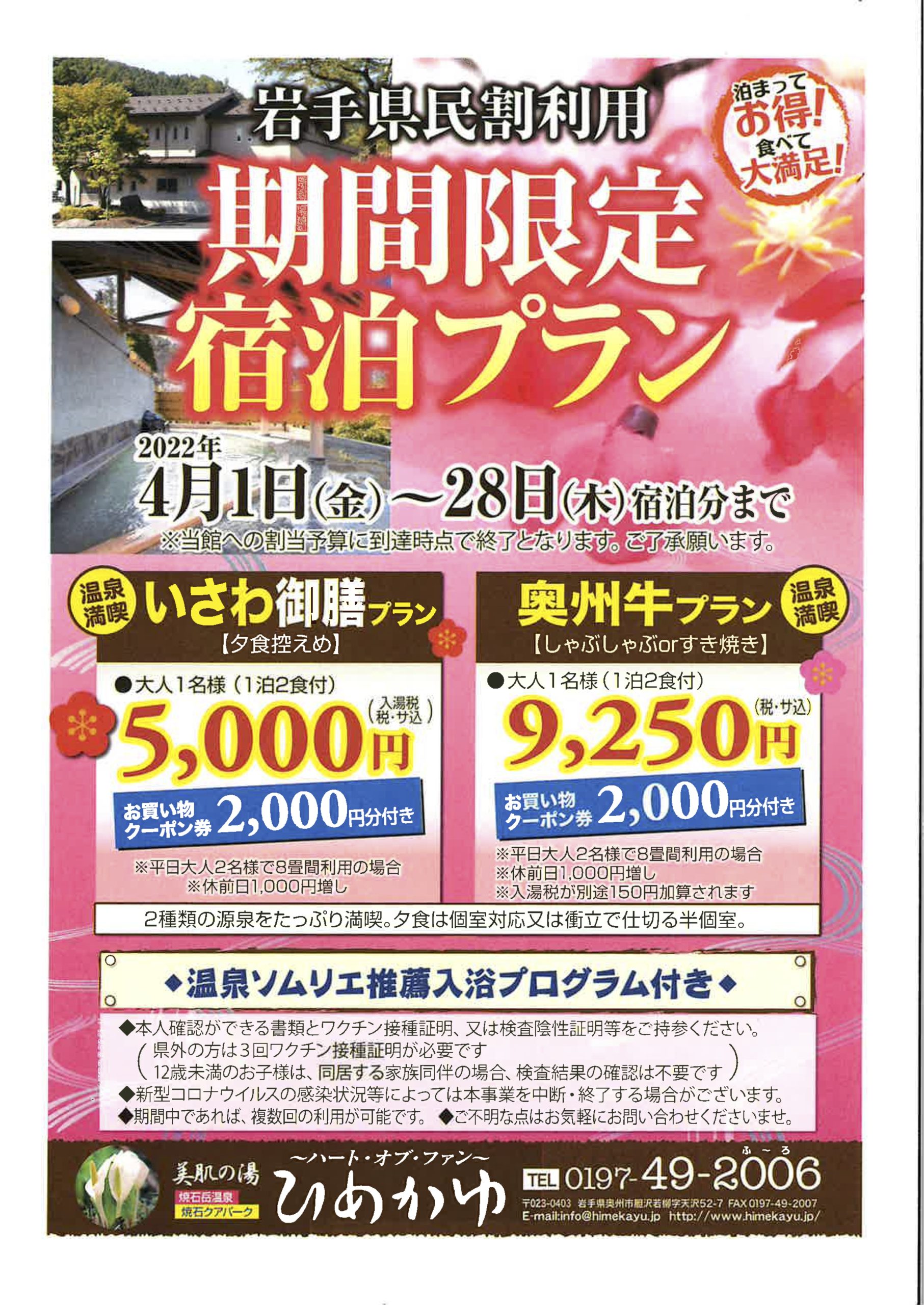 いわて旅応援ご利用でお得な「温泉満喫 いさわ御膳プラン」のご案内です。