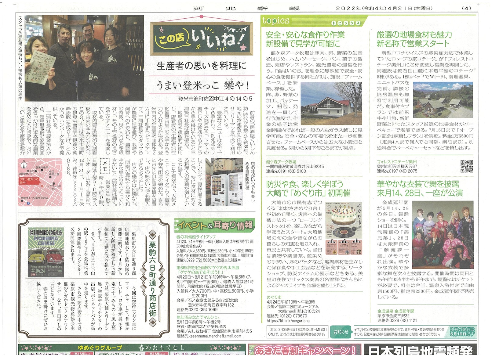 河北新報の広域版に記事が掲載されました。コテージではバーベキューなどもお楽しみいただけますので、暖かくなってきたこの機会にぜひひめかゆでお越しくださいませ。