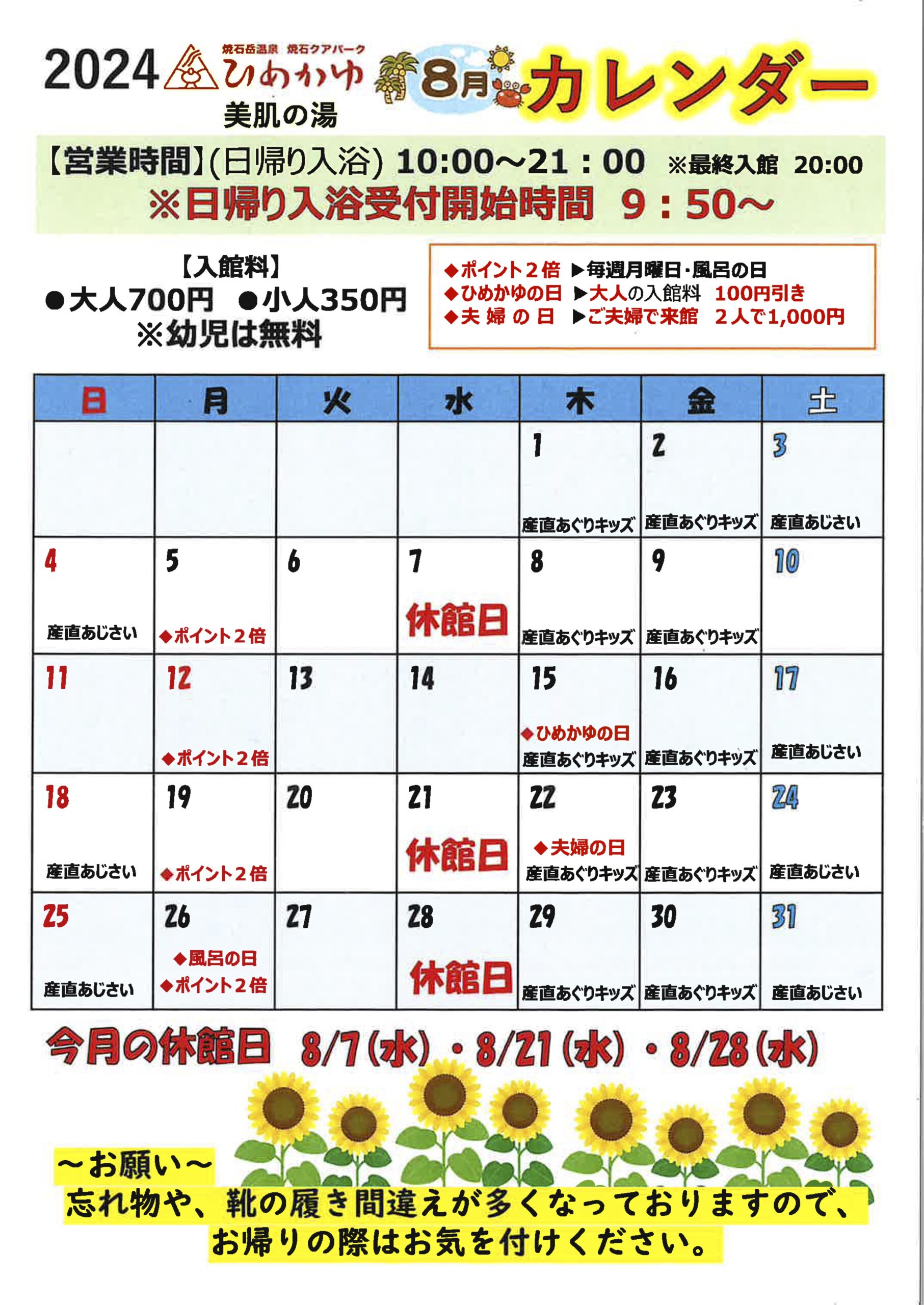8月のイベントカレンダーとなります。