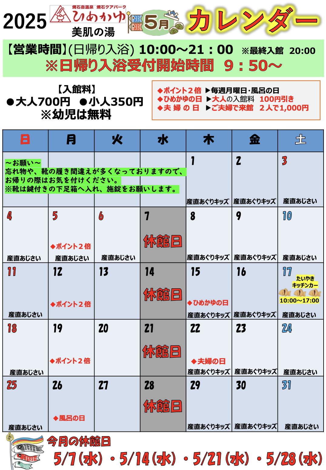 5月のイベントカレンダーです! 皆様のお越しをお待ちしております。