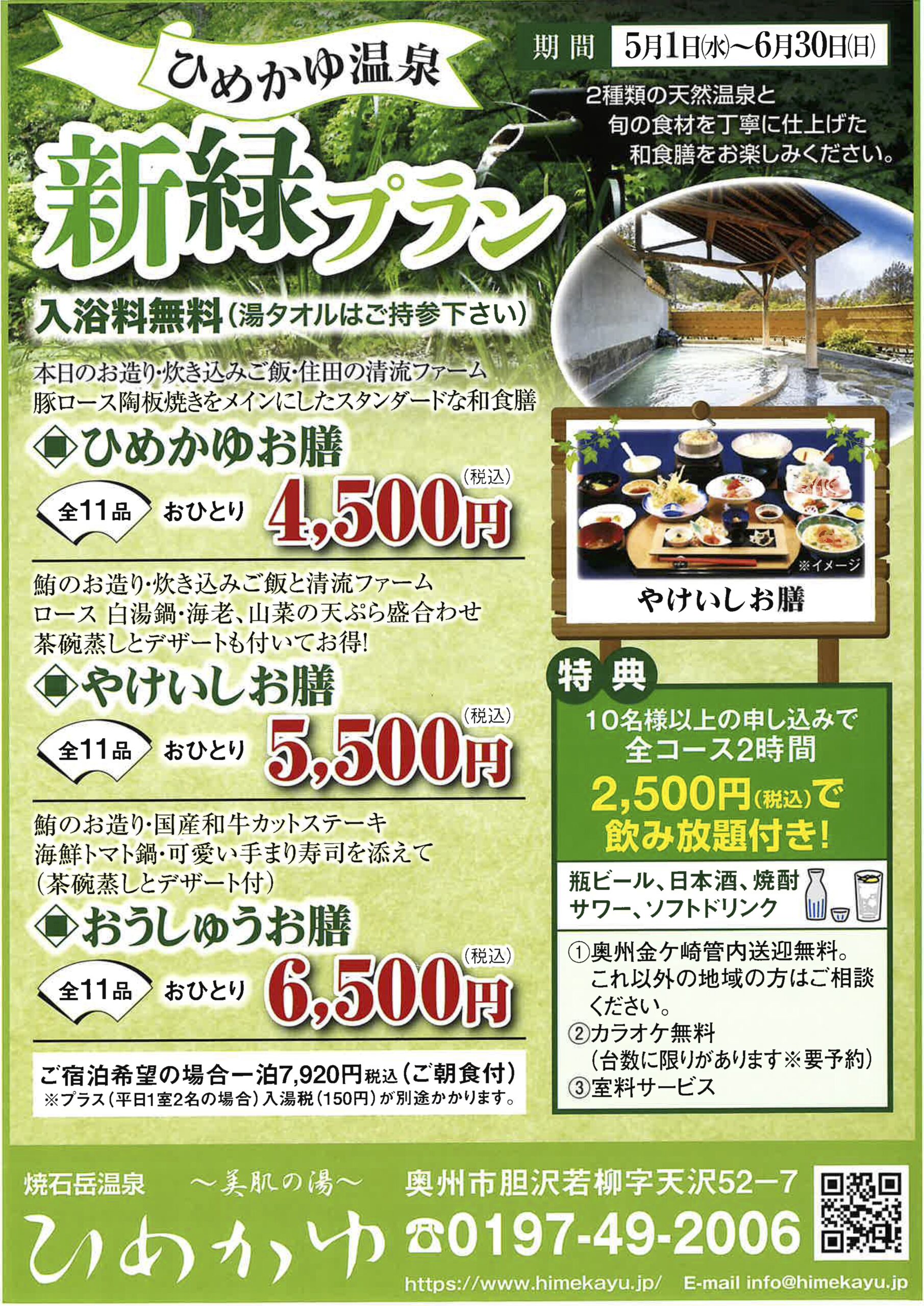 5月〜6月までのご宴会プラン 新緑の中、2種類の天然温泉と旬の食材をお楽しみください。