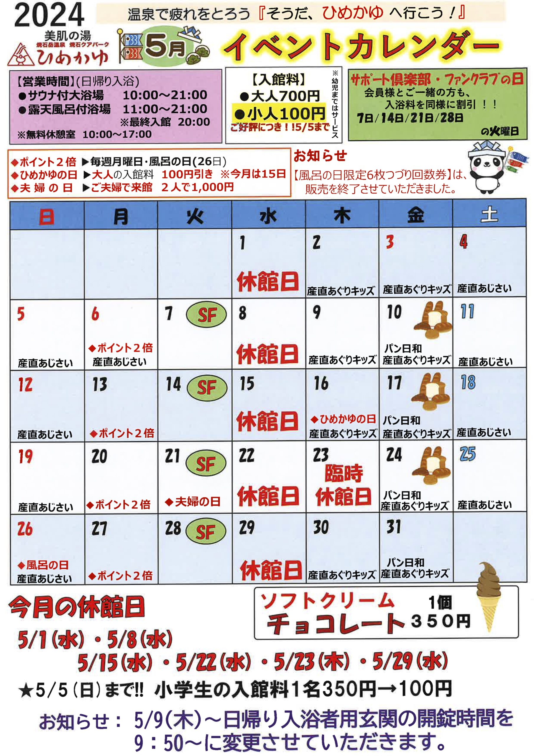 5月のソフトクリームはチョコレートが完売いたしました。 5月9日より抹茶のフレーバーへと変更になります。 今月は毎週水曜日の他、23日木曜日も休館日となります。