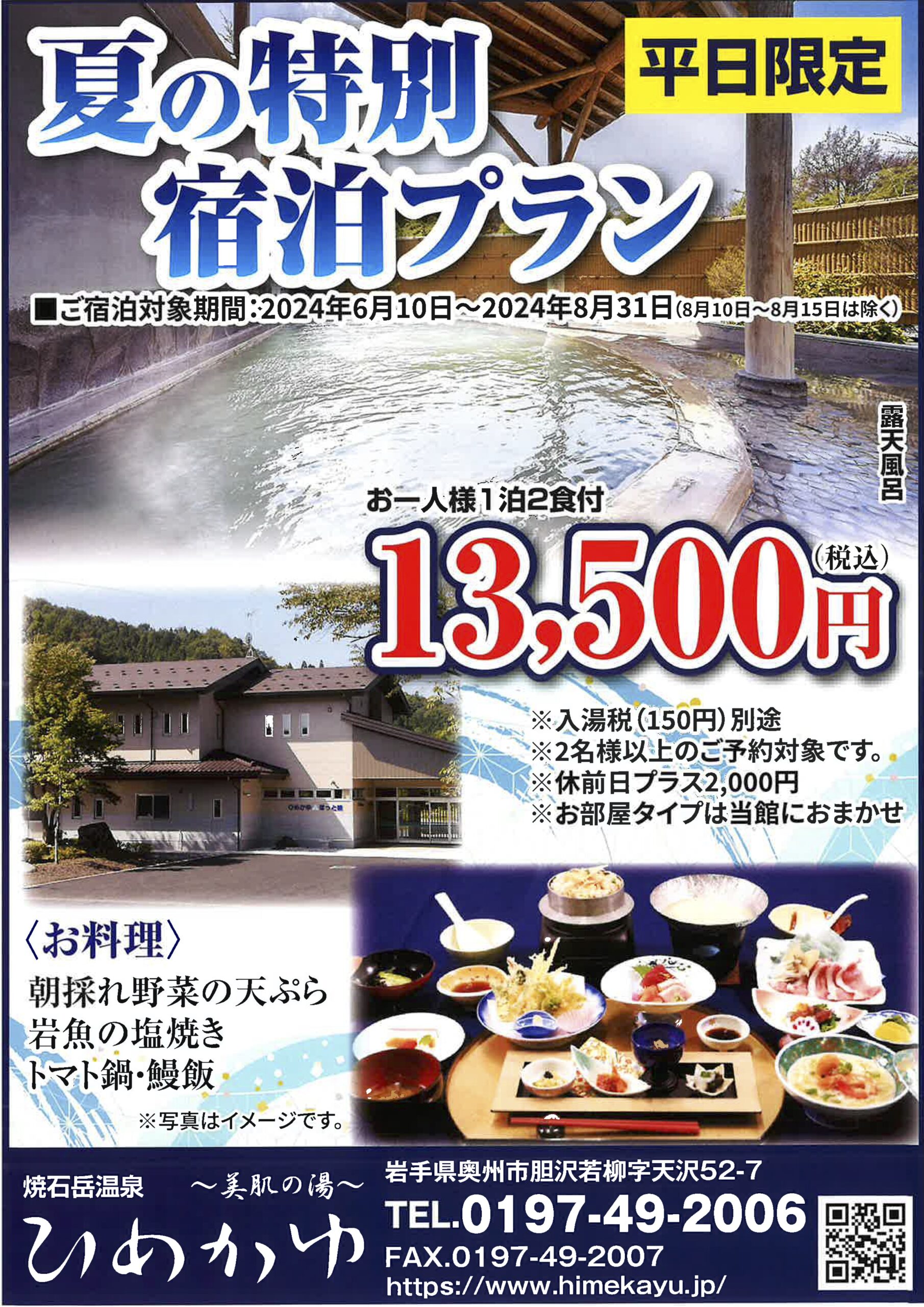 平日限定のお得な宿泊プランが6月10日〜8月31日までご利用頂けます。 ご予約はお電話にて承ります。
