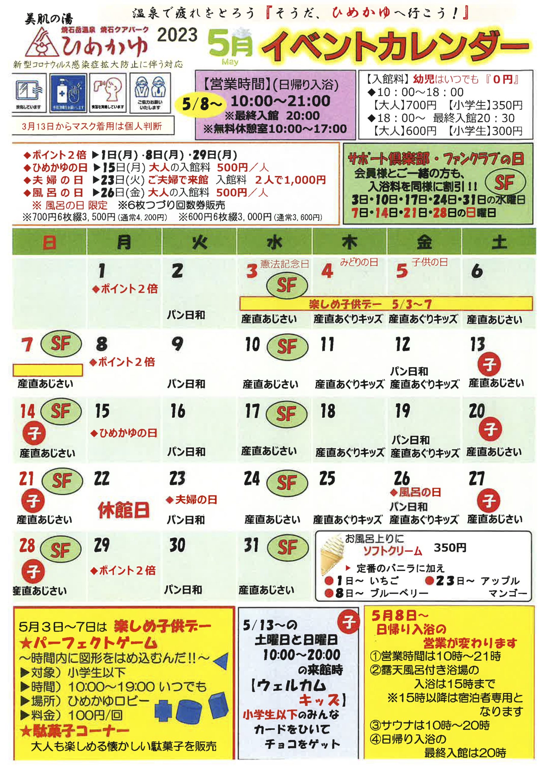 5月のイベントカレンダーになります。 5月はGWや田植えなどお忙しい時期ですが、 ひめかゆの温泉やお料理でどうぞお寛ぎくださいませ。